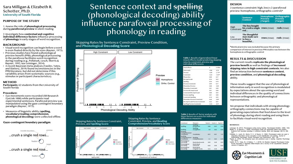 This year’s CUNY Conference on Human Sentence Processing was held virtually due to the coronavirus pandemic. That means that Sara’s video walk-through of her poster (and the poster and the transcript) is available in perpetuity for your viewing pleasure at this link https://osf.io/umzvx/. Her project, which is also her masters thesis, explores the factors that influence how people extract phonological information from words before looking at them (i.e., phonological preview benefit). She finds that phonological preview benefit requires strong expectations from the sentence context and a reader with good phonological decoding abilities.